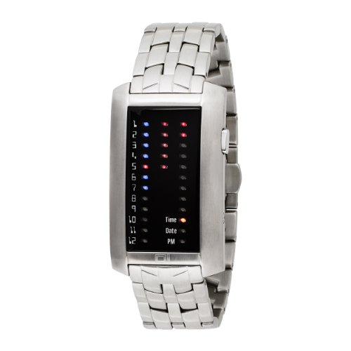 Sleek stainless steel gives The One Men's Ibiza Ride Fashion IR System Watch's vertical-link band and smooth bezel an industrial-looking contrast to a black dial. A rectangular stainless steel case joins to a stainless steel band, topped by a stainless steel bezel. Three rows of red and blue lights illuminate to reveal the time in binary code. Additional colored lights on the dial's lower right corner tell the time, the date, and AM/PM. This timepiece arrives in a metal tin along with an instructional booklet and is water resistant to 99 feet (30 m).