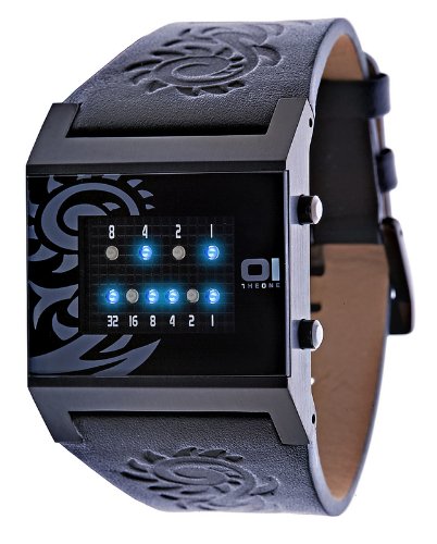 Express yourself with the Men's Kerala Trance Binary Fashion Watch from avant-garde designer 01TheOne. Seamlessly inset into the imprinted, black leather strap, the wide, blue dial features an innovative binary code for telling time. Using an on/off system to designate what to count, the bright, blue LED lights add up to the precise time. The top row represents the hours and the bottom row the minutes. If you like to be on the cutting edge, you'll love the wondering looks in people's eyes as they peer over your shoulder at your wrist. This cutting edge timepiece is water resistant to 99 feet (30 meters).