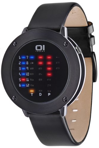 A bold look and an innovative time-telling system combine to make the 01TheOne Midsize Ibiza Ride Watch an expression of your individuality. Framed by a solid stainless steel case with screw details, the large, round, black dial features a unique array of LED lights that help you tell the time and date. With a push of the button, the first two columns track the hours or months, the third column marks the minutes or days, and the remaining two columns add up the ones to give you a precise reading. A smooth, black leather strap matches the dark tones of the case and fastens with a traditional buckle for an adjustable fit. This cutting edge timepiece is water resistant to 99 feet (30 meters).